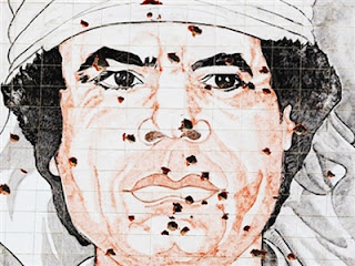 Lỗ chỗ vết đạn trên tranh vẽ ông Moammar Gadhafi trên tường một tòa nhà ở Tripoli. Ảnh: AP